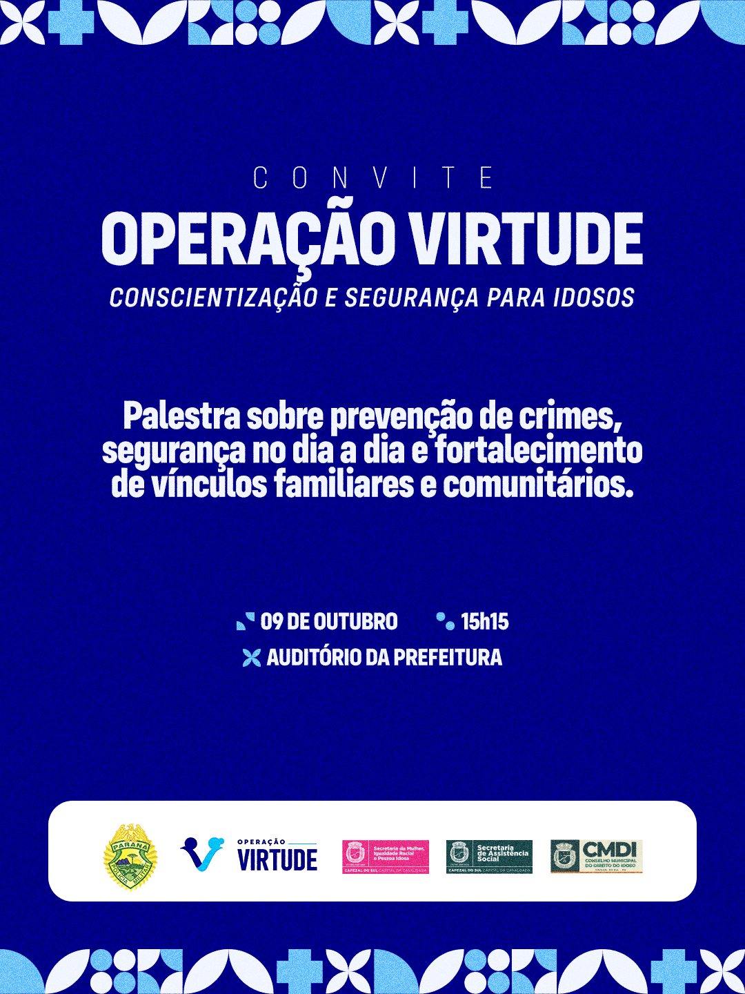 As Secretarias da Mulher, Igualdade Racial e Pessoa Idosa e da Assistência Social, em parceria com a Polícia Militar do Paraná (25º Batalhão), convidam a população idosa para participar da palestra “Operação Virtude – Conscientização e Segurança para Idosos”.