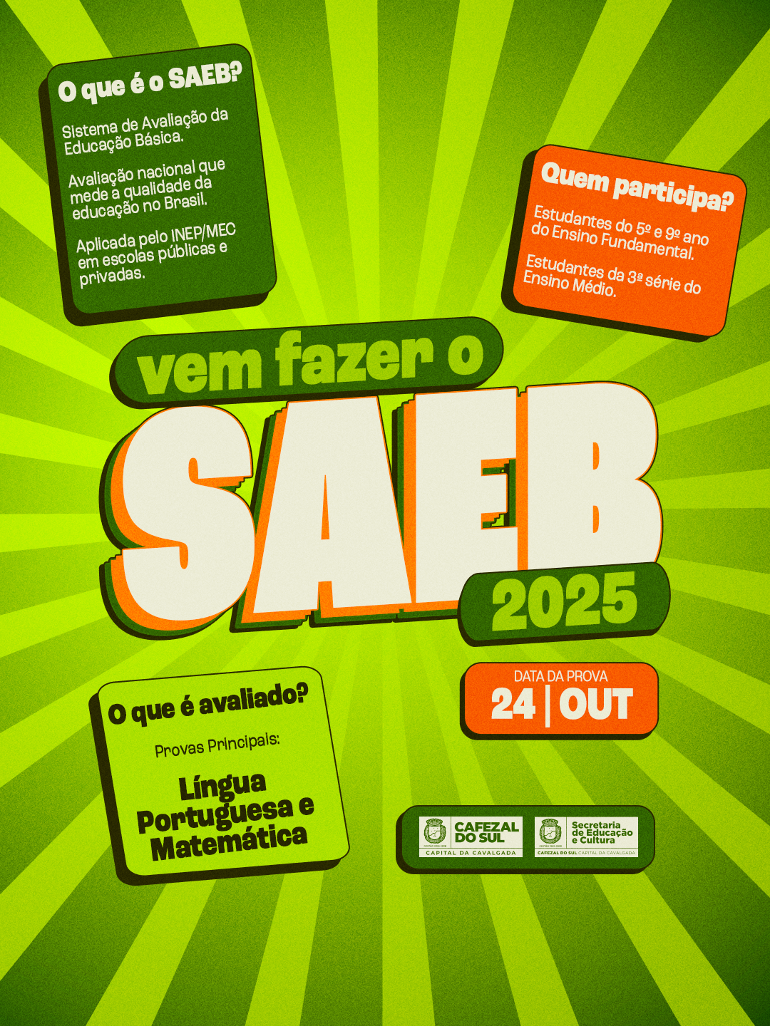 Nesta quinta-feira, dia 24 de outubro, os alunos das escolas municipais participam da Prova Saeb (Sistema de Avaliação da Educação Básica) — um importante momento para demonstrar tudo o que aprenderam ao longo do ano letivo.